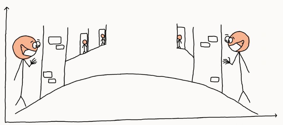 وجد باحثون من جامعة "برينستون" الأمريكيّة، أنّ المحادثات العاديّة يمكن أن تخلق تدفّقاً مخروطيّاً للهواء "يشبه النفّاثة"، يحمل القطرات لأمتار. وما يثير القلق، أنّ تدفّق الهواء هذا يمكنه بسهولة وبسرعة نقل جزيئات صغيرة من المتحدّث إلى المتحدَّث إليه. وتبيّن أنّ عبارات قصيرة يمكنها نقل الجسيمات إلى ما بعد مسافة متر واحد. قال الدكتور هوارد ستون: "إذا تحدّثت لمدّة 30 ثانية بصوت عال، فستقوم بإلقاء الهباء الجويّ إلى أكثر من ستّة أقدام تُجاه من تحدّثه".