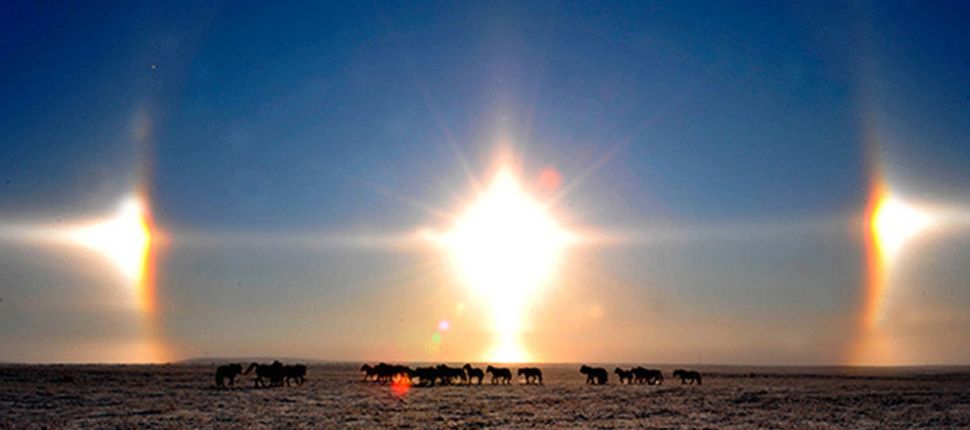 حصلت ظاهرة غريبة تسبّبت في ظهور ثلاث شموس في منطقة ناديم شمالي غربي روسيا، تسمّى بـ"الشمس الكاذبة"، وهي عبارة عن رؤية الشمس الحقيقيّة مضافاً إلى شموس زائفة تظهر نتيجة انعكاس أشعّة الشمس على البلّورات الثلجيّة المحمّلة في السحاب. (سكاي نيوز عربيّة)