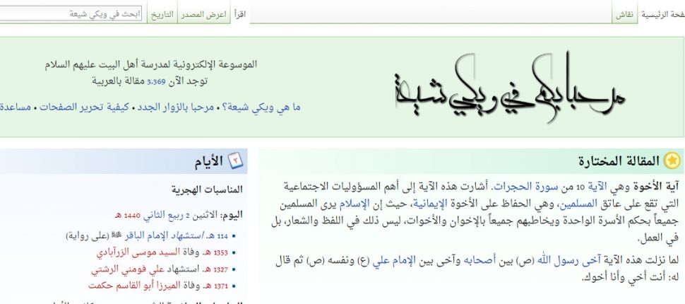 وأفادت وكالة الأنباء القرآنية الدولية (إكنا) أنه تم إزاحة الستار عن أكبر موسوعة افتراضية لأهل البيت عليهم السلام تحت عنوان "ويكي شيعة" على شبكة الإنترنت وذلك بحضور الرئيس الإيراني "الشيخ الدكتور حسن روحاني". وتم إطلاق الموسوعة الافتراضية لأهل البيت عليهم السلام على شبكة الإنترنت بعنوان: "www.wikishia.net"