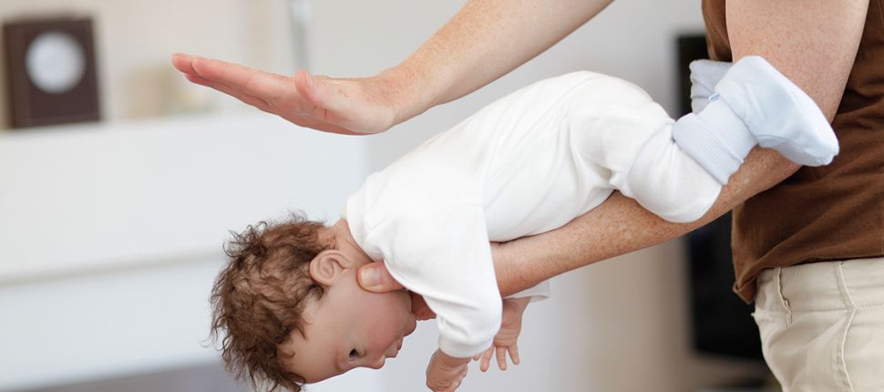الوضعية الأولى: ضعي طفلكِ على ذراعك بحيث يكون وجهه إلى أسفل مع مراعاة أن يكون بقيّة جسمه أعلى من رأسه وقومي بتسديد ( 6 – 10 ) ضربات خفيفة برسغ يدك من الخلف في منطقة ما بين الكتفين.