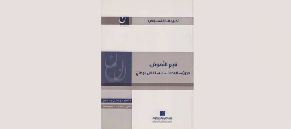 في هذا الكتاب، "قيم النهوض : الحرية – العدالة- الاستقلال الوطني"، والذي هو من ضمن سلسلة "أدبيات النهوض"، من إعداد معهد المعارف الحكمية، تعريب محمد حسن زراقط، تنقسم الموضوعات بشكل أكاديمي إلى ستة أقسام، الأول منها بعنوان "الحرية بين الإسلام وإعلان حقوق الإنسان"، تتعدد فيه الطروحات بين حرية العقيدة ومقارنة بين الإسلام والمسيحية، وحرية المعتقد بين القبول والرفض، والدافع الغربي للتحرر وخطأ الإعلان العالمي للحقوق. وفي القسم الثاني "الحرية المسؤولة بوصفها مدخلاً للإيمان والرشد السياسي"، يتحدث فيه عن الإسلام وحرية التفكير، ويعرض لنماذج من الحرية الإسلامية. في القسم الثالث "الحفاظ على الهُوية بوصفه قيداً للحرية"، يطرح تجربة كلية الإلهيات. القسم الرابع "العدالة الاجتماعية" يتمحور النقاش فيه حول العدالة وأصالتي الفرد والمجتمع. القسم الخامس يركز فيه البحث حول الاستقلال والحرية، حيث يناقش التبعية الثقافية والاجتماعية. وفي القسم السادس والأخير يخصص فيه الطرح للمعنوية في الثورة الإسلامية. يعالج الشهيد مطهري قدس سره في هذا الكتاب مفاهيم ومصطلحات عديدة من أهمها مبحث "النهوض وقيمه". وهو يقصد به كل تطور اجتماعي يصيب مجتمعنا الإسلامي، لذا يفضل بعض الكتّاب أن يستخدم مصطلح النهضة الحسينية بدل الثورة الحسينية.