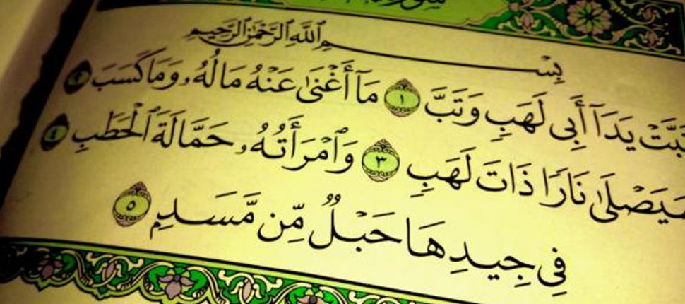 ﴿تَبَّتْ يَدَا أَبِي لَهَبٍ وَتَبَّ *مَا أَغْنَى عَنْهُ مَالُهُ وَمَا كَسَبَ *سَيَصْلَى نَارًا ذَاتَ لَهَبٍ *وَامْرَأَتُهُ حَمَّالَةَ الْحَطَبِ *فِي جِيدِهَا حَبْلٌ مِّن مَّسَدٍ﴾.